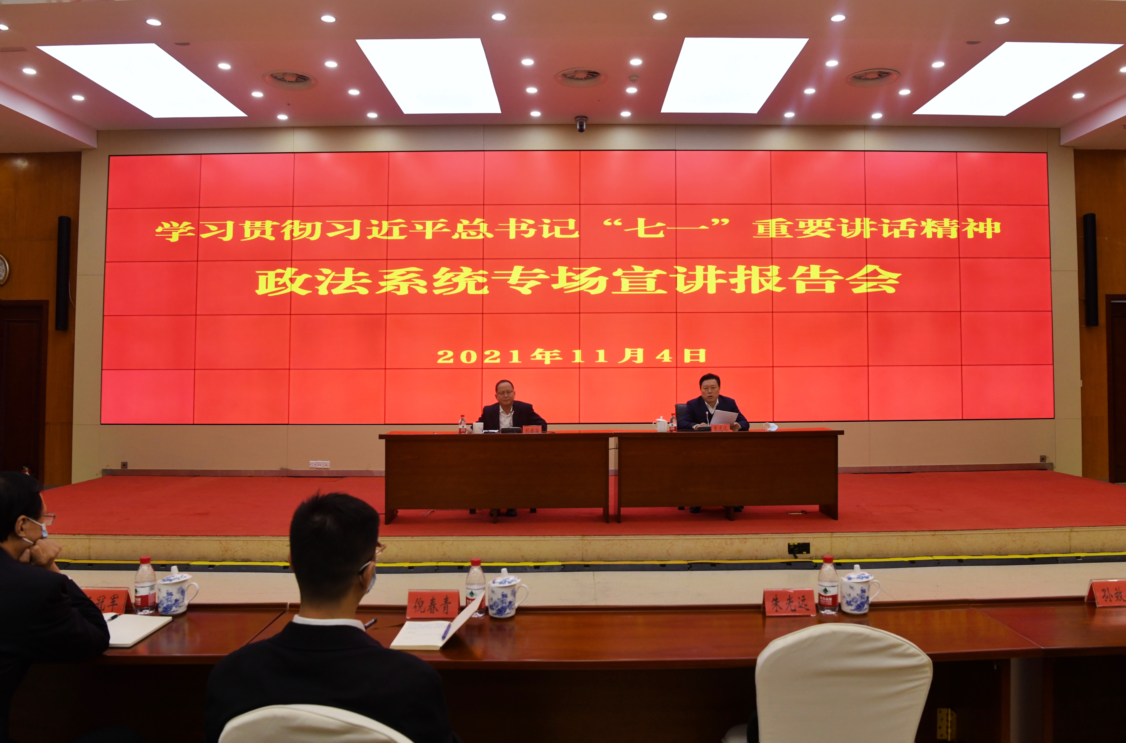 11月4日,深入学习贯彻习近平总书记“七一”重要讲话精神政法系统专场宣讲报告会在南京举行。省委宣讲团成员、省政协文史委副主任、研究员刘德海作宣讲报告,省委政法委常务副书记朱光远主持报告会。
